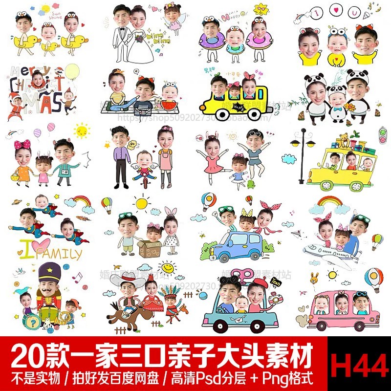 Chibi-H44, Bộ 20 PSD mẫu thiết kế ảnh chibi ghép đầu cắt dán hoạt hình gia đình 3 người vui chơi hạnh phúc bên nhau
