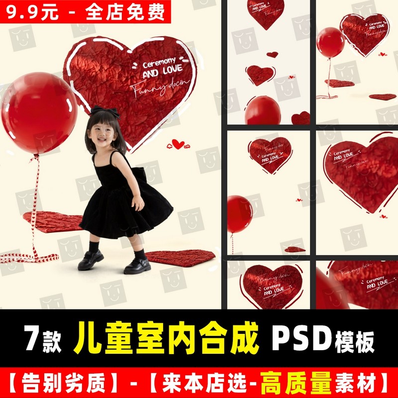 G113, Bộ 7 PSD chất liệu thiết kế studio nền bóng bay trái tim màu đỏ hoạt hình dễ thương cho ảnh gia đình cha mẹ và con cái