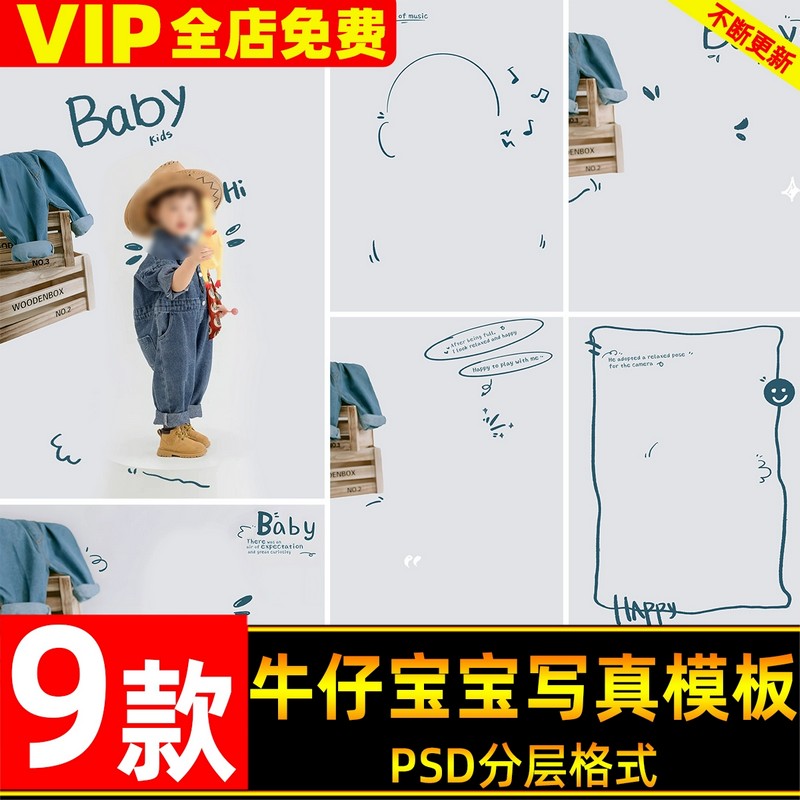 PSD-4988, Bộ 9 PSD mẫu thiết kế hậu kỳ ảnh trẻ em studio sinh nhật 100 ngày phong cách quần Jean sáng tạo vải bò Denim