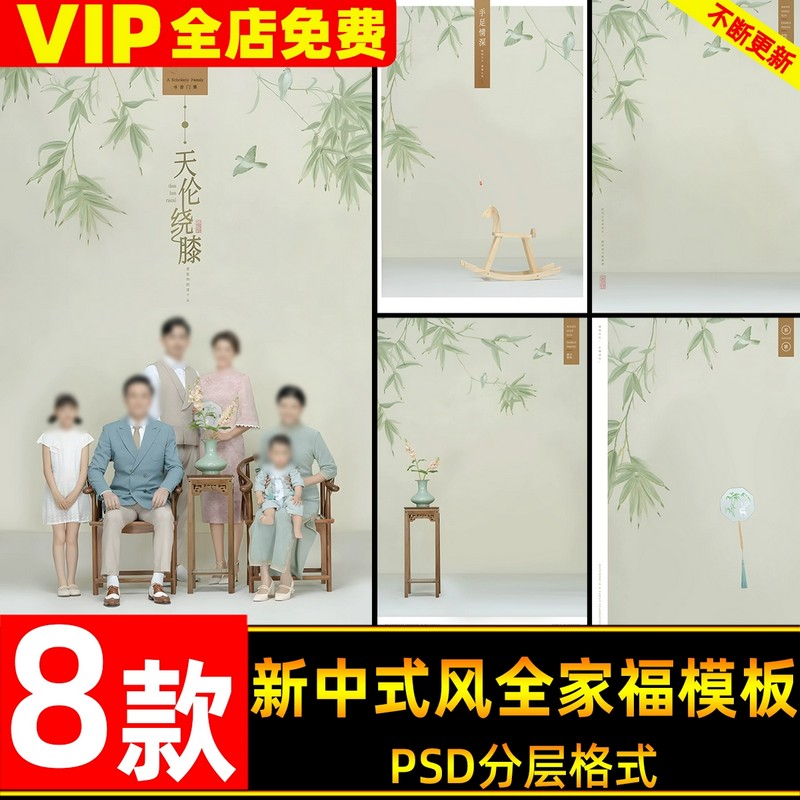 PSD-5165, Bộ 8 PSD mẫu chụp ảnh gia đình phong cách Trung Hoa hiện đại – tông màu thanh nhã, tranh công bút truyền thống