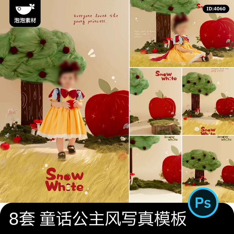 PSD-7813, Bộ 8 PSD mẫu thiết kế ghép ảnh trẻ em chủ đề truyện cổ tích phong cách hoạt hình nàng Bạch tuyết bên cây táo