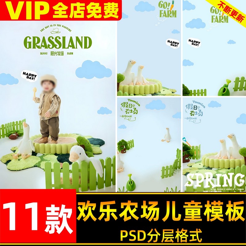 PSD-8187, Bộ 11 PSD mẫu ghép ảnh sinh nhật bé chủ đề trang trại vui nhộn, tông xanh lá cây nhẹ nhàng, phong cách Grassland Farm