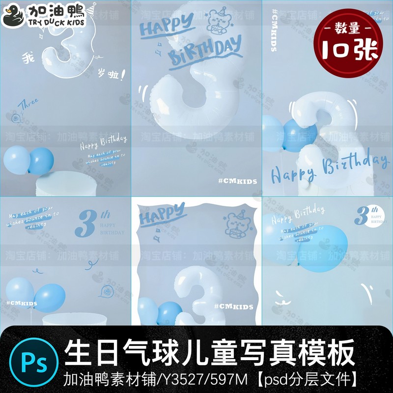Y3527, Bộ 10 PSD mẫu thiết kế bánh sinh nhật hình bóng bay phong cách graffiti màu xanh ghép ảnh trẻ em sinh nhật lần thứ 3